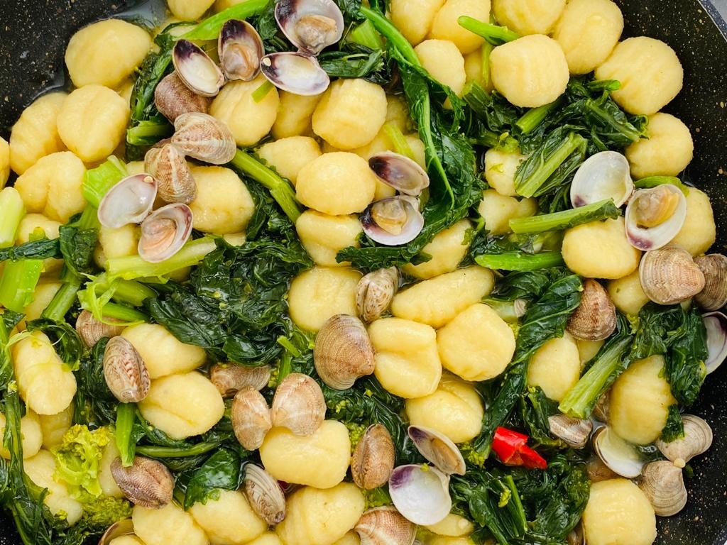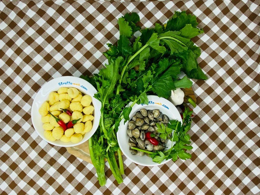 Ortaggi autunnali tipici del sud che custodiscono un alto contenuto di polifenoli antiossidanti, le cime di rapa sono un alimento della cucina povera che oggi si presta nella preparazione di molti piatti prelibati grazie al gusto particolare e lievemente piccante. Gli gnocchi, che abbinano in modo eccezionale vongole e cime di rapa, sono una originale alternativa alla tradizionale pasta con le vongole. Questi molluschi sono gustosi ma anche leggeri ed energizzanti grazie ai sali minerali, ai preziosi acidi grassi e alle proteine nobili di cui sono ricchi.