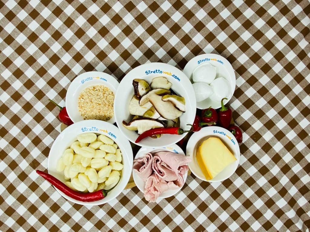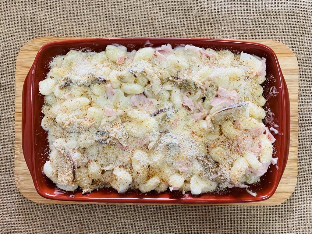 Se utilizzate i funghi freschi puliteli eliminando la terra, tagliateli e fateli cuocere in padella con due cucchiai di olio per 10 minuti e aggiungete un pizzico di sale. Fate bollire gli gnocchi e, dopo averli scolati, metteteli in una ciotola e amalgamateli con la besciamella. Aggiungete la scamorza a dadini, la mozzarella, metà del parmigiano, i funghi ed il prosciutto cotto tagliato a strisce sottili. Mescolate e distribuite tutto su una teglia spolverando sopra un’abbondante manciata di pangrattato. Aggiungete il parmigiano rimasto, infornate gli gnocchi per 10 minuti a 200 gradi e completate la cottura al grill per 5 minuti. Servite gli gnocchi gratinati tiepidi.