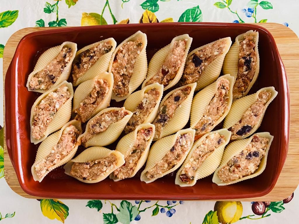 Cuocete i conchiglioni in abbondante acqua salata, scolateli al dente e bloccate la cottura con acqua fredda. Conditeli con olio per non farli attaccare fra loro. Tritate col mixer il tonno aggiungendo le olive, i pomodorini secchi, i capperi dissalati e un po’ di polpa di pomodoro. Aggiungete anche la ricotta con un pizzico di sale e create un composto uniforme con cui farcire i conchiglioni. Dopo averli riempiti spalmate un velo sottile di passata di pomodoro condita con un filo d’olio e versatela anche sul fondo della teglia su cui sistemare i conchiglioni. Fateli cuocere a 180 gradi per 15 minuti e completate il piatto con del basilico fresco. Servite i conchiglioni tiepidi.