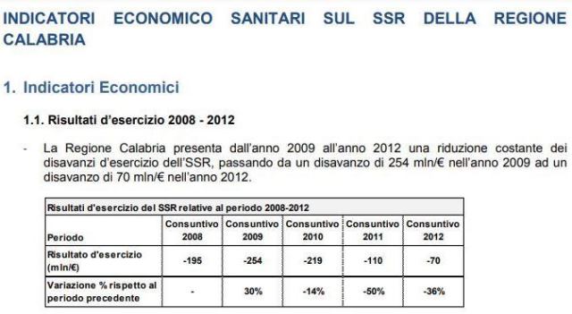 Per analizzare le parole del conduttore di “Quarta Repubblica”, è stato necessario andare a consultare dei dati ufficiali pubblicati nell’aprile 2014 dalla Regione Calabria, relativi ai risultati del bilancio 2010-2013 del Servizio Sanitario territoriale. Si tratta nello specifico proprio del primo periodo di commissariamento, quando il Governo italiano aveva affidato la questione all’allora Presidente di Regione Giuseppe Scopelliti. Come si evince dal grafico, “dall’inizio del piano di rientro (2010) la Regione Calabria ha ridotto la perdita annua di esercizio di € 232,4 mln, pari ad una riduzione percentuale di circa 88%”. Il PreConsuntivo del risultato economico per l’anno 2013 si attesta a infatti a circa €-31 mln. “I risultati raggiunti – si legge ancora nel documento – sono il frutto della riduzione degli sprechi, del processo di razionalizzazione della spesa e progressiva riorganizzazione della macchina sanitaria regionale. Il processo avviato si concluderà nel 2015 con l’obiettivo di portare la Regione al pareggio economico”.
