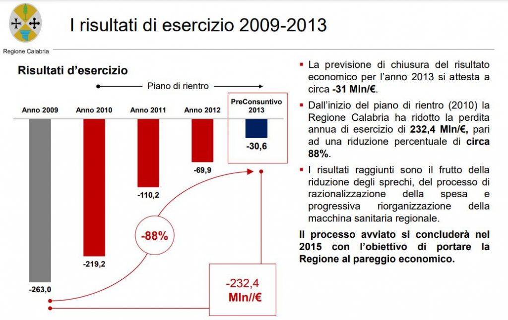 Per analizzare le parole del conduttore di “Quarta Repubblica”, è stato necessario andare a consultare dei dati ufficiali pubblicati nell’aprile 2014 dalla Regione Calabria, relativi ai risultati del bilancio 2010-2013 del Servizio Sanitario territoriale. Si tratta nello specifico proprio del primo periodo di commissariamento, quando il Governo italiano aveva affidato la questione all’allora Presidente di Regione Giuseppe Scopelliti. Come si evince dal grafico, “dall’inizio del piano di rientro (2010) la Regione Calabria ha ridotto la perdita annua di esercizio di € 232,4 mln, pari ad una riduzione percentuale di circa 88%”. Il PreConsuntivo del risultato economico per l’anno 2013 si attesta a infatti a circa €-31mln. “I risultati raggiunti – si legge ancora nel documento – sono il frutto della riduzione degli sprechi, del processo di razionalizzazione della spesa e progressiva riorganizzazione della macchina sanitaria regionale. Il processo avviato si concluderà nel 2015 con l’obiettivo di portare la Regione al pareggio economico”.