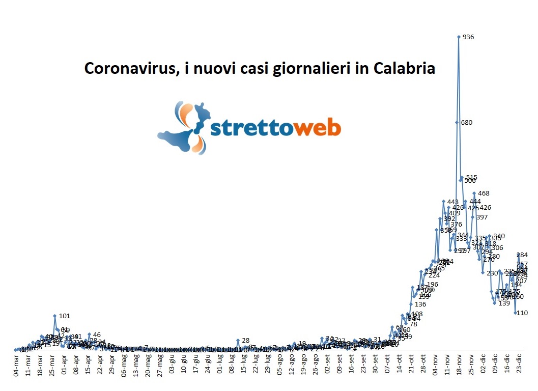 Ecco il grafico con l’andamento dei nuovi casi di contagio giornaliero in Calabria: