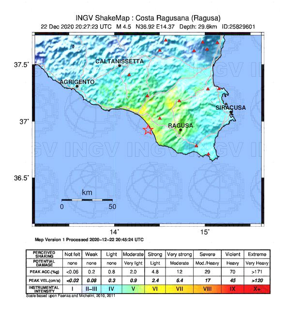 Una forte scossa di terremoto si è verificata pochi minuti fa e precisamente alle 21:27 a Vittoria in provincia di Ragusa. La scossa che ha avuto epicentro a Scoglitti, è stata avvertita in tutta la Sicilia orientale e soprattutto a Catania, Ragusa e Siracusa ma anche a Reggio Calabria. Il sisma ha avuto magnitudo 4.4 a 29.6 chilometri di profondità. La profondità dell’ipocentro ha consentito alle scosse sismiche di dissiparsi risalendo il sottosuolo, estendendo la zona del risentimento sismico a tutta l’isola, alla Calabria e a Malta e per questo motivo non ci sono stati danni.