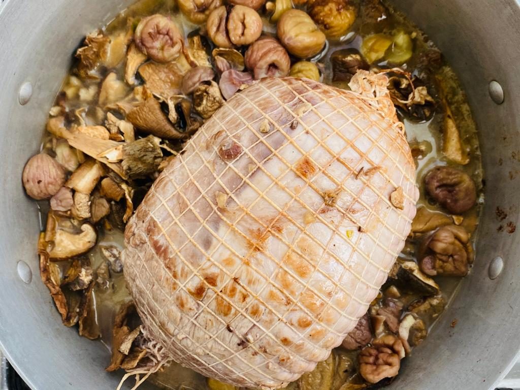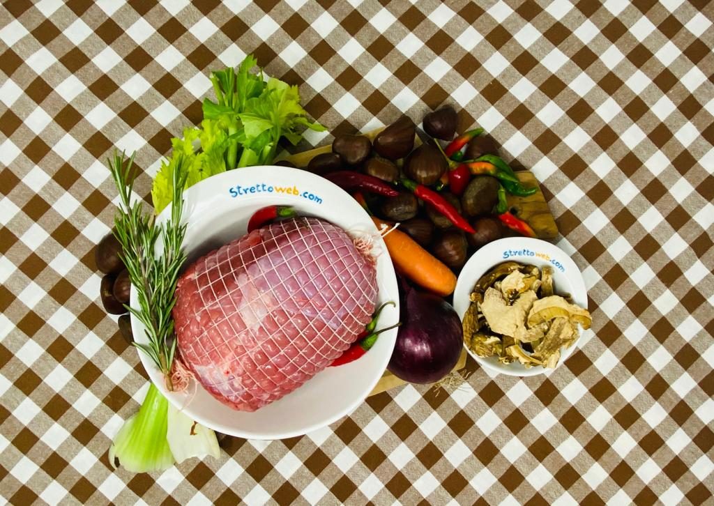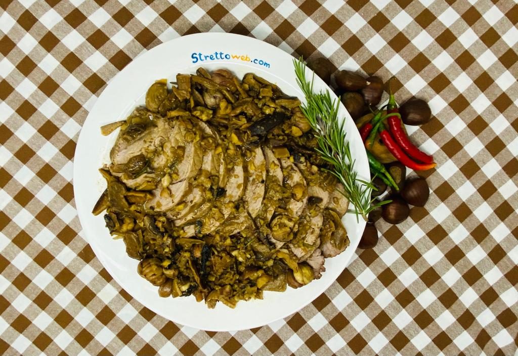 Un secondo piatto versatile l’arrosto di carne perché può essere accompagnato ogni volta da un condimento diverso. La carne di vitello, alimento ricco di proteine ad alto valore biologico, di vitamine, minerali essenziali e ferro, in questo piatto è impreziosita dalle castagne: frutti delle nostre aree montane ricchi di una elevata percentuale di amidi, sali minerali, grassi, proteine e vitamine, erano considerate nei periodi di carestia un alimento essenziale. I funghi, con il loro gusto intenso, completano questo arrosto spiccatamente autunnale.