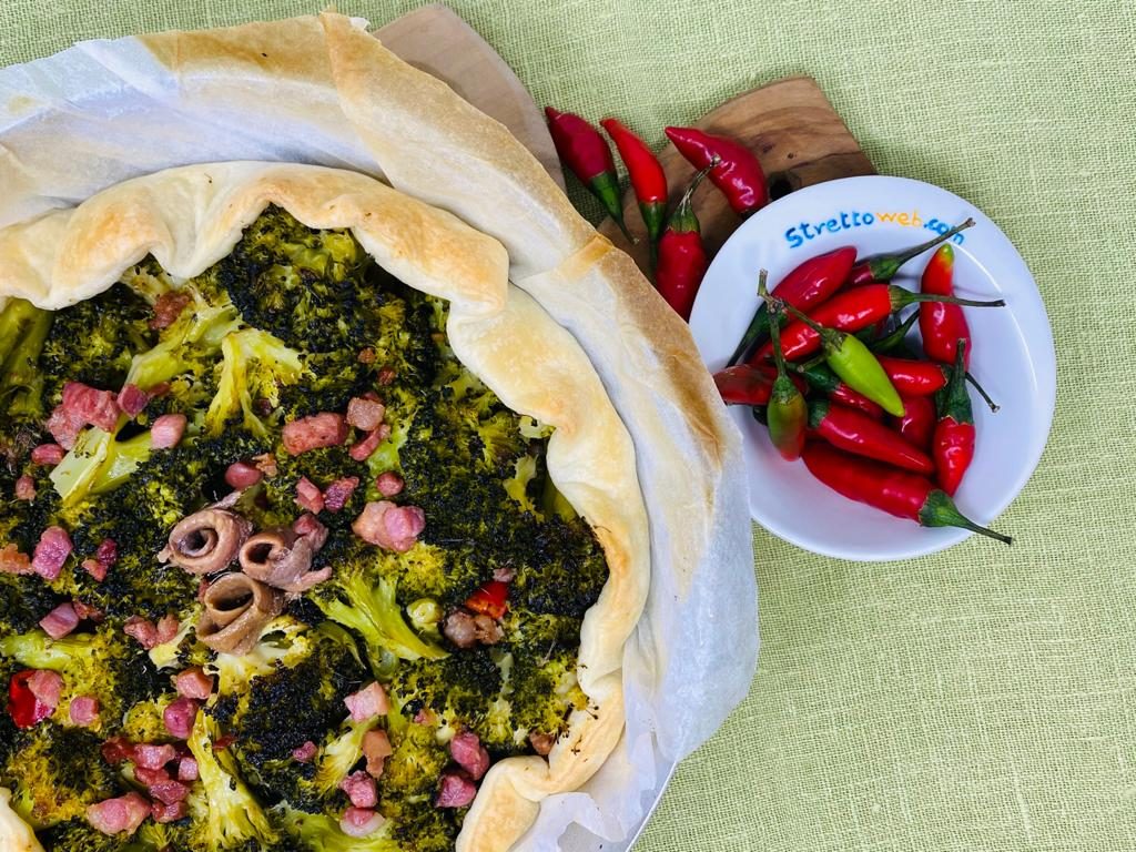 La torta salata con broccoli pancetta e alici racchiude il gusto acceso dei prodotti calabresi: la bontà dei broccoli locali, il sapore delle alici, la consistenza della pancetta e l’inevitabile peperoncino sono contenuti in questa sfoglia croccante e facile da realizzare.