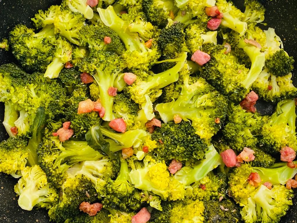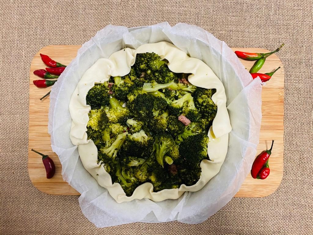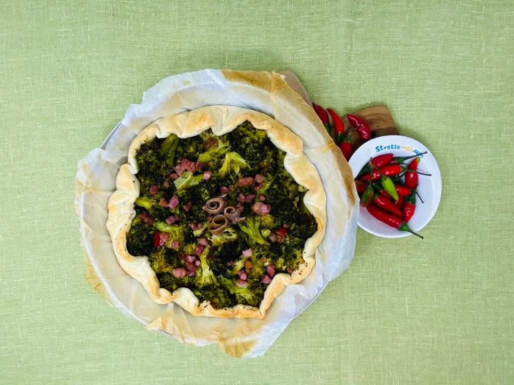 I broccoli, ortaggi perfetti per piatti nutrienti e gustosi, hanno infinite qualità nutrizionali, un alto potere antiossidante e sono ipocalorici ed energizzanti. I broccoli “ffucati” calabresi, cucinati in padella ben coperti ed a fuoco basso con olio, aglio e peperoncino, sono un contorno nutriente che si accosta perfettamente a secondi di carne o salsiccia. Il mix saporito di questa torta salata comprende anche le alici: poco costose e da sempre presenti nella cucina calabrese, sono ricche di proteine dall’alto valore biologico, vitamine, minerali e acidi grassi omega-3 utili al cuore. La pancetta completa il piatto offrendogli una nota gustosa e croccante.