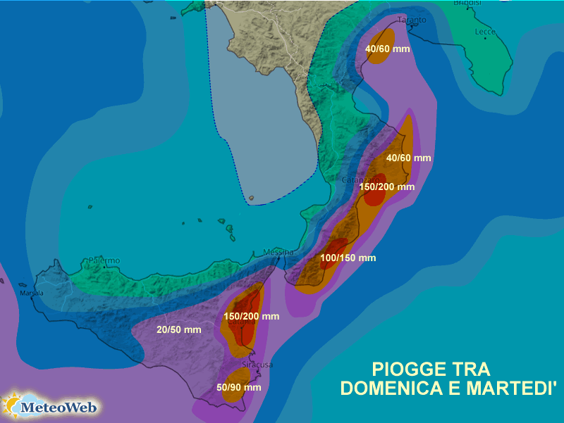 Un ciclone afro mediterraneo provocherà forte maltempo da domenica tra la Sicilia e la Calabria. I temporali sono attesi nel corso del 20 dicembre e proseguiranno lunedì 21, fino a martedì 22. Saranno, quindi, tre giorni all’insegna di piogge insistenti con accumuli che potranno raggiungere su molte aree i 40/50 ma anche i 60/80/90 millimetri e punte sino a 150/200. Le aree maggiormente esposte dalla tempesta saranno la provincia di Catania e Catanzaro e l’area metropolitana di Reggio Calabria. Dalla mappa in basso è possibile vedere le aree nel dettaglio: