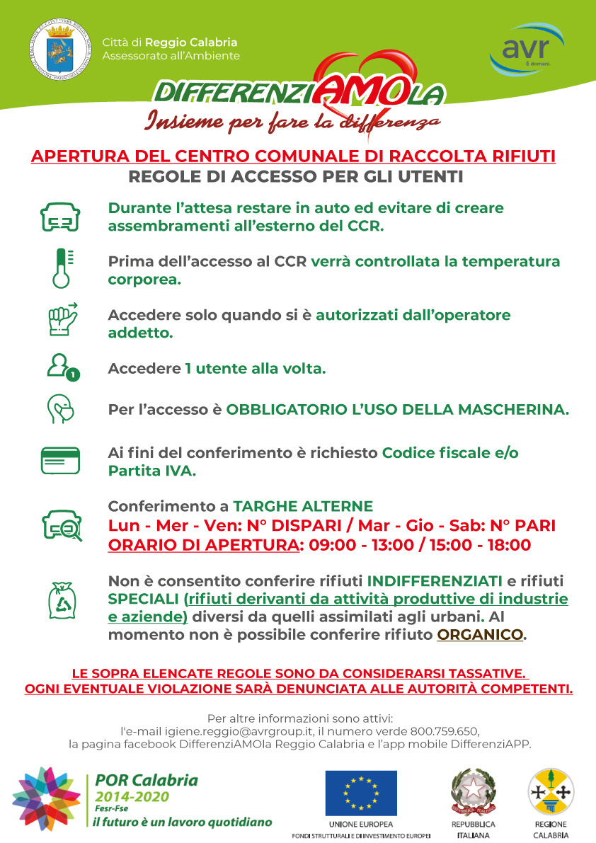 L’ufficio stampa di AVR informa i cittadini che “DA MERCOLEDÌ 2 DICEMBRE 2020, in virtù delle nuove disposizioni ministeriali in vigore dal 29 novembre 2020, verrà riaperto il Centro Comunale di Raccolta rifiuti, sito in via Reggio Campi II Tronco a Condera.