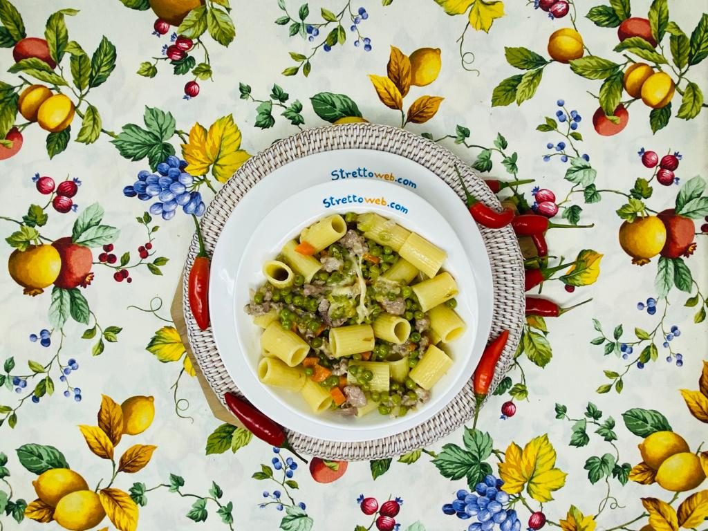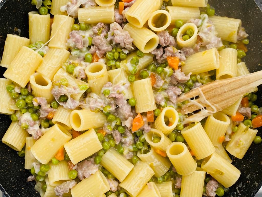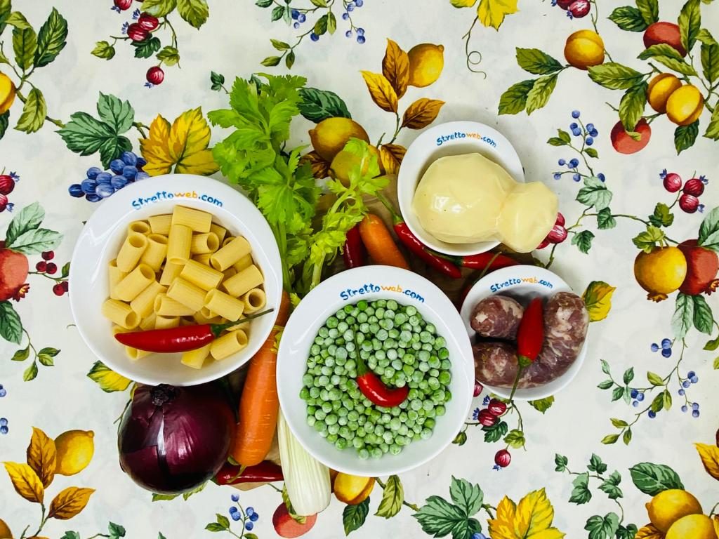 I rigatoni con scamorza, salsiccia e piselli si consumano al momento.