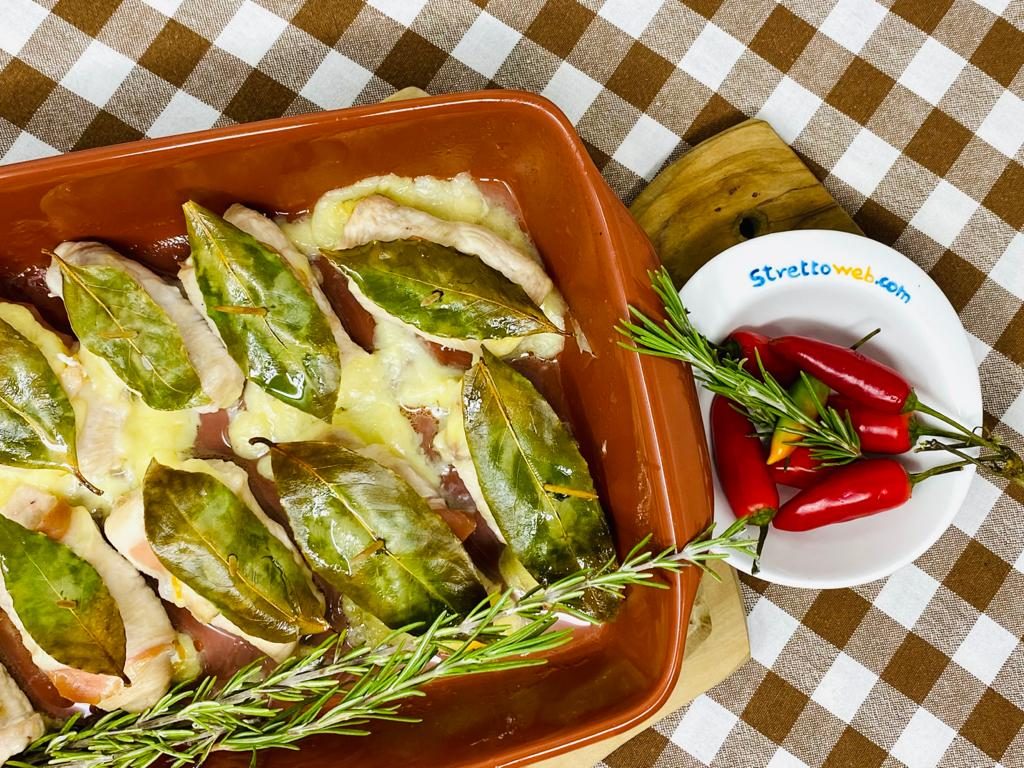 Pulite le fettine di pollo e battetele col batticarne. Su ogni fetta di pollo sistemate una fetta di scamorza ed una di speck, arrotolatela su sé stessa e fermatela con uno stuzzicadenti in cui avrete inserito una foglia di alloro. Sistemate i rotolini su una teglia appena oleata ed unite un rametto di rosmarino. Infornateli a 180 gradi per 20 minuti e serviteli caldi.