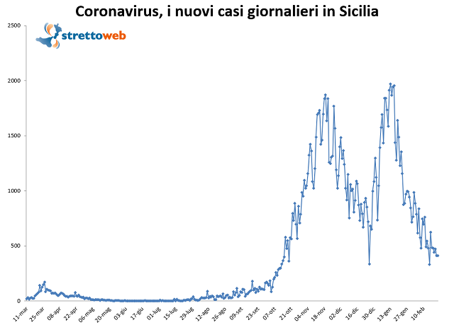 Oggi, 22 Febbraio, in Sicilia ci sono stati 19 morti, 206 guariti e 411 nuovi casi positivi al Coronavirus su 18.558 persone sottoposte a tampone. Nelle ultime 24 ore in Sicilia è risultato positivo il 2,2% dei soggetti sottoposti a test. Secondo quanto riporta il bollettino ufficiale fornito dalla Regione, i nuovi casi rilevati oggi sono così suddivisi:
