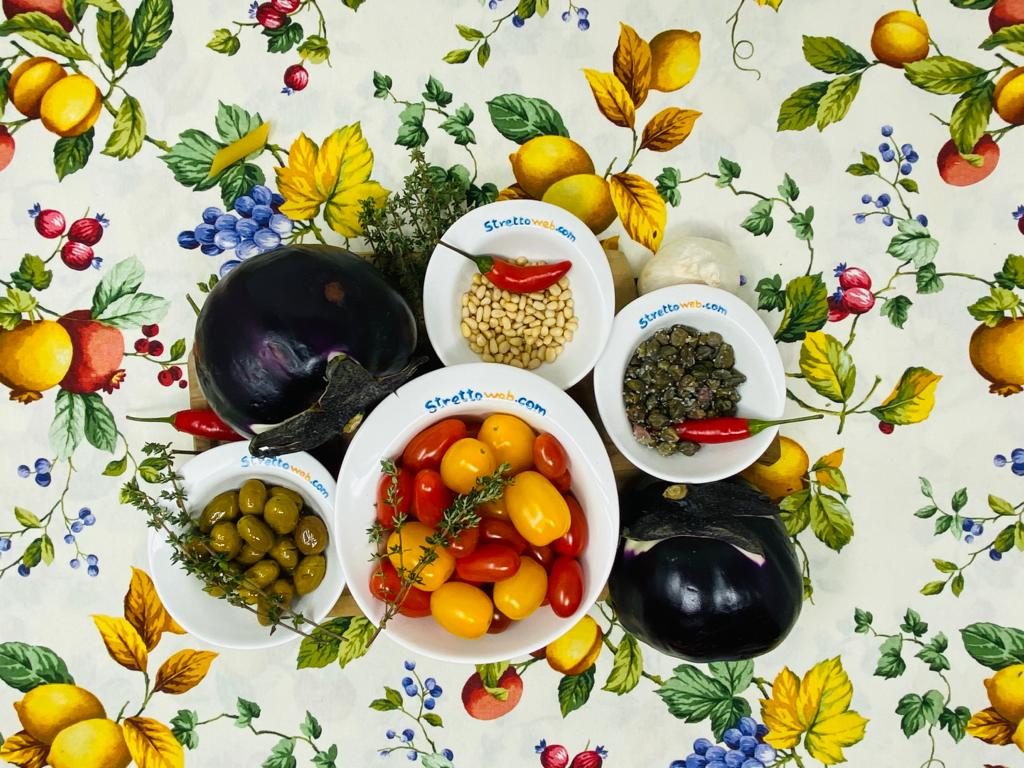 Rosolate l’aglio in padella con un filo d’olio e appena sarà dorato spostatelo ed unite le melanzane lavate, tagliate a cubetti e lasciate sotto sale per 20 minuti circa. Aggiungete poca acqua, copritele e fatele cuocere per 10/15 minuti. Aggiungete i capperi, le olive e i pinoli, mescolate con cura ed unite per ultimi i pomodorini tagliati a metà. Proseguite la cottura a fiamma bassa per 5 minuti e servitele.
