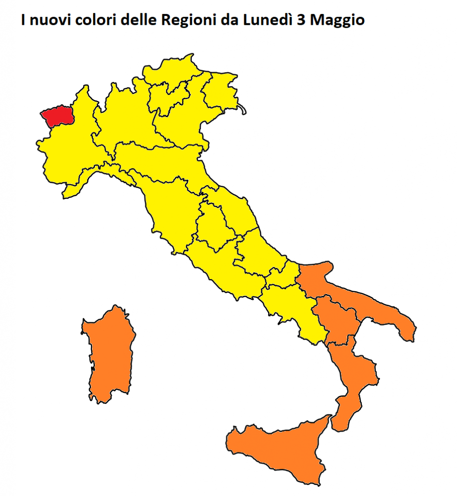 Ufficiali i nuovi colori delle Regioni, clamorose le ordinanze ufficializzate pochi minuti fa del ministro della Salute Roberto Speranza. Da Lunedì 3 Maggio la Valle d’Aosta torna in zona rossa ed è l’unica Regione a cambiare colore verso misure più restrittive, a causa dell’incidenza dei nuovi casi settimanali che supera i 250 ogni 100.000 abitanti. Cambia colore, ma verso le riaperture, la Sardegna che torna in zona arancione dopo il rosso. Rimangono in giallo tutte le Regioni che erano in zona gialla, compresa la Campania dove la situazione è peggiorata sensibilmente. La Regione con Napoli capoluogo, infatti, ha l’indice Rt più alto d’Italia (1.08) e il governatore De Luca minaccia addirittura la “zona rossa”, ma il ministro Speranza ha deciso di lasciare la Regione in giallo.