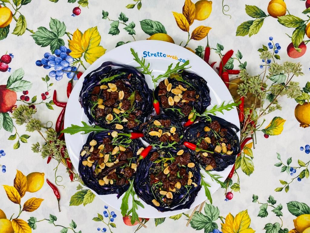 Le fette di cavolo viola croccanti e ricoperte da rucola, frutta secca e pomodori sott’olio sono un contorno sano e sfizioso. Capace di racchiudere una miniera di antiossidanti e considerato non a caso un superfood, il cavolo viola è un ortaggio versatile che col suo sapore particolare si presta nella realizzazione di molti piatti.