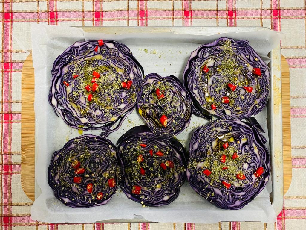 Tagliate il cavolo viola a fette e sistematele su una teglia rivestita da carta forno. Tritate l’aglio e unitelo in una ciotola a sale, pepe, origano e peperoncino. Condite le fette di verdura col sale agli aromi e l’olio ed infornatele a 180 gradi per circa 25 minuti. Appena sfornate aggiungete sopra la rucola, la frutta secca ed i pomodori sott’olio. Azionate il grill e infornate ancora il cavolo cappuccio per 2-3 minuti. Servitelo subito.