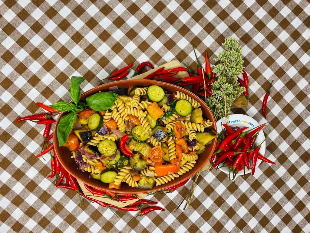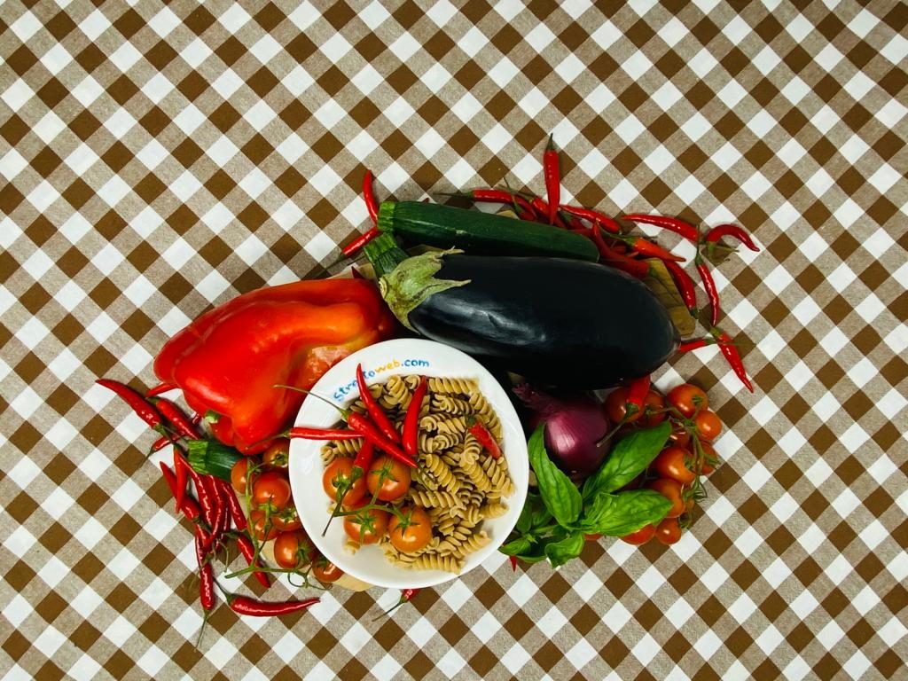 Saporita e nutriente, la pasta integrale ha un gusto deciso e particolare ma soprattutto è un alimento completo e ricco di fibre e di proteine vegetali. Grazie al suo potere saziante aiuta a tenere sotto controllo il peso ed ha effetti protettivi sulla salute. Il delicato abbinamento dei fusilli integrali agli ortaggi regala un primo piatto leggero e gustoso allo stesso tempo. I peperoni in Calabria sono fra gli ortaggi estivi più versatili: si consumano crudi, arrostiti, ripieni, in tortiera o in peperonata ed il loro contenuto calorico è basso pur essendo ricchi di proprietà antiossidanti e depurative, di vitamina C e sali minerali. Poco caloriche, depurative e remineralizzanti sono anche le zucchine, squisite fritte, ripassate in padella, grigliate, al forno, in parmigiana o ripiene. Le melanzane, che occupano un posto centrale nella cucina calabrese, hanno un alto potere drenante grazie alla quantità di acqua di cui sono composte e sono un alimento ipocalorico se cucinate nel modo adeguato.