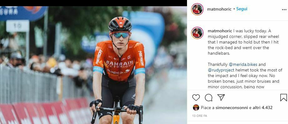 L’impatto è stato terribile, le conseguenze meno gravi di quanto ci si poteva aspettare. Si definisce ‘fortunato’ Matej Mohoric che, nella tappa di ieri del Giro d’Italia 2021, è stato protagonista di una brutta caduta. Nella discesa successiva a Passo Godi, il ciclista della Bahrain Victorious ha perso il controllo della bici picchiando violentemente la testa sull’asfalto. L’ausilio del casco gli ha salvato la vita. Il ciclista ha commentato l’accaduto su Instagram, aggiornando i fan sulle proprie condizioni di salute: “oggi sono stato fortunato. Una curva mal giudicata, è scivolata la ruota posteriore che sono riuscito a trattenere ma poi ho sbattuto contro le rocce e sono volato oltre il manubrio. Per fortuna la bici Merida e il casco hanno sfruttato al meglio l’impatto e ora mi sento bene. Niente ossa rotte, solo piccoli lividi e piccole commozioni cerebrali, ora monitorati dal nostro staff medico Deluso di lasciare il Giro d’Italia ma più determinato che mai per la mia prossima gara“.