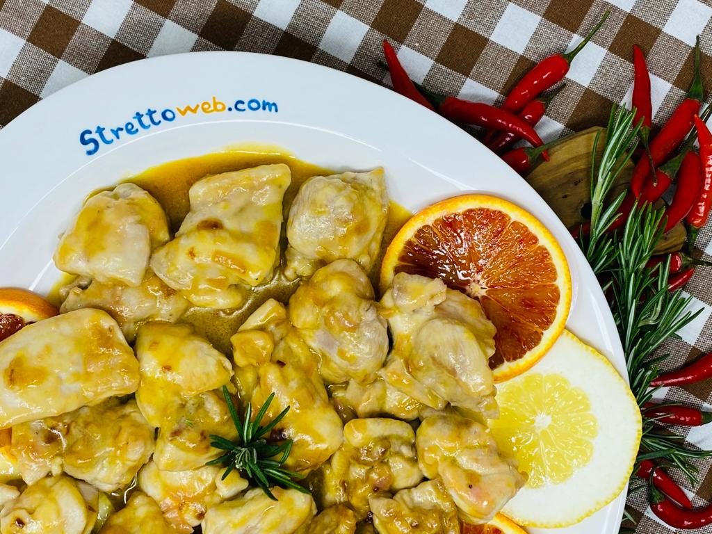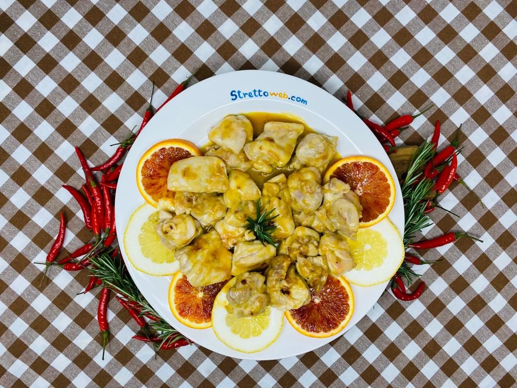 Fate tagliare in bocconcini le sovracosce di pollo dal macellaio, infarinateli e versateli in una padella dove avrete fatto rosolare in olio caldo lo scalogno e qualche ago di rosmarino. Fate cuocere qualche minuto il pollo prima di sfumarlo col vino bianco, aggiungete quindi anche il succo di un limone e di un’arancia e proseguite la cottura per 10 minuti circa.
