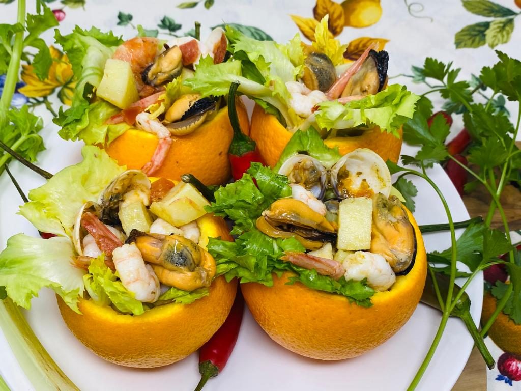 Vero classico della cucina italiana l’insalata di mare col suo sapore delicato è ideale sia come antipasto che come secondo piatto. Racchiusa in coppette di arancia e realizzata con molluschi e crostacei uniti a dadini di verdure regala gusto, leggerezza e nutrienti.