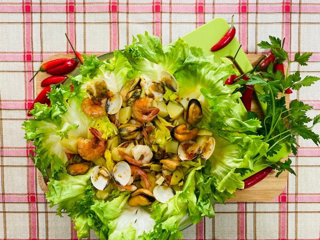 Potenti antiossidanti capaci di rallentare l’invecchiamento cellulare le cozze sono fonte di proteine nobili utili al mantenimento della massa muscolare, sono anche un integratore naturale di ferro assimilabile e la presenza di vitamina B e minerali come iodio e magnesio aiuta a contrastare gli stati di affaticamento. In questa ricca insalata sono accostate ai gamberi, crostacei gustosissimi dal basso contenuto calorico e ad un goloso misto mare che racchiude anche vongole e calamari.
