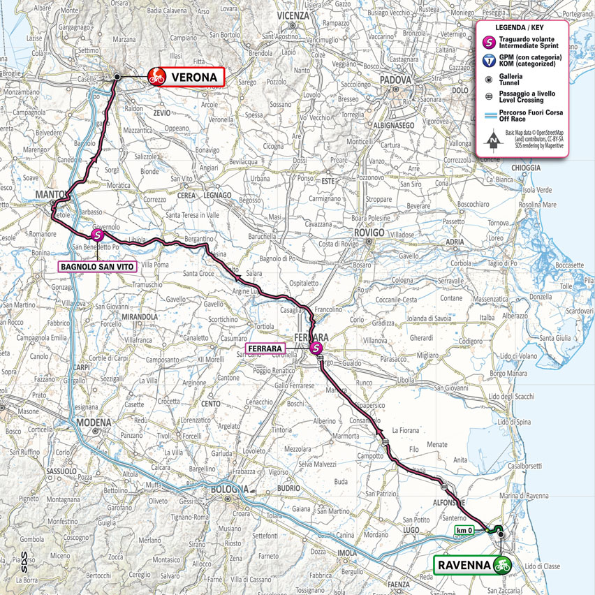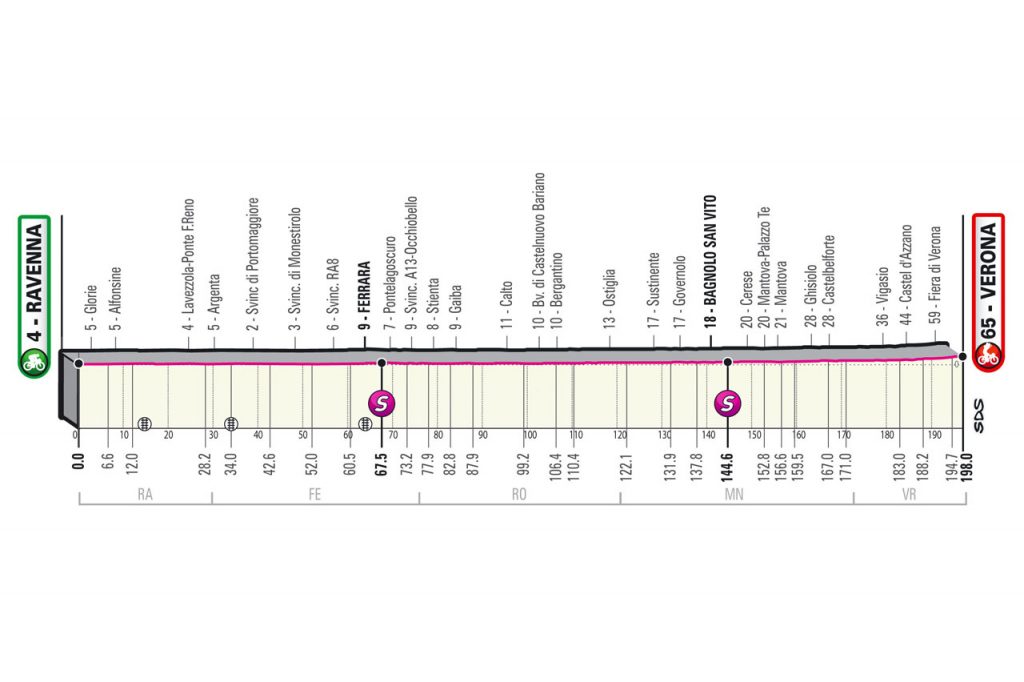 La 13ª tappa del Giro d’Italia 2021 rappresenta l’ultimo giorno utile per conservare le energie in vista delle Alpi. La frazione odierna celebra la figura di Dante Alighieri nel 700° anniversario della sua morte. La partenza sarà da Ravenna, luogo in cui è stato sepolto il Sommo Poeta, dopo 198 km si arriverà al traguardo di Verona, città nella quale Dante visse in esilio. La carovana rosa passerà anche da Bagnolo Po, terra di Learco Guerra, l’uomo che indossò per la prima volta la maglia rosa. La frazione non presenta difficoltà altimetriche, il percorso è completamente pianeggiante: sono presenti 2 traguardi volanti, il primo a Ferrara (km 67.5) e il secondo a Bagnolo San Vito (km 144.6). Il finale sarà su Corso Porta Nuova vicino l’Arena di Verona.