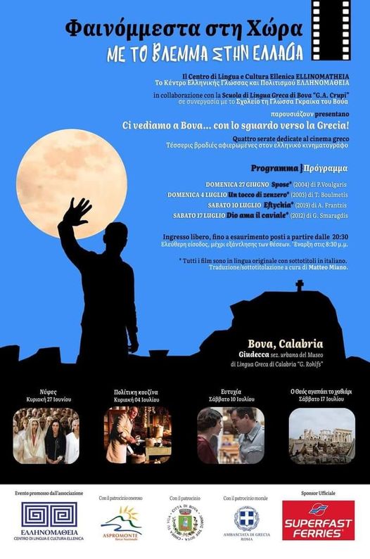 Nell’estate del bicentenario della rivoluzione greca, il Centro Di Lingua e Cultura Ellenica ellinomatheia, ha scelto Bova, luogo storico particolarmente importante per l’ellenismo mediterraneo per realizzare la rassegna cinematografica “Fenommesta sti Chora… con lo sguardo verso la Grecia”. Nella suggestiva cornice della Giudecca di Bova, sezione urbana del Museo di Lingua Greco-Calabra “G. Rohlfs” saranno proiettati quattro interessanti film premiati del cinema greco (in versione originale con i sottotitoli in italiano, a cura del filologo neogrecista Matteo Miano), fino al 17 luglio 2021. Gli appuntamenti previsti, Domenica 4 Luglio e poi il Sabato 10 ed infine il sabato 17 Luglio, sono patrocinati dal Comune di Bova, dal Parco Nazionale dell’Aspromonte e dell’Ambasciata di Grecia a Roma. La rassegna cinematografica “Fenommesta sti Chora… con lo sguardo verso la Grecia” sponsorizzato dalla principale compagnia marittima greca SUPERFAST FERRIES, ha come obiettivo quello di portare la Grecia nel cuore della Calabria ellenofona. L’evento mira a sostenere l’antica lingua dei Greci di Calabria, un importante patrimonio della cultura immateriale dell’Aspromonte Greco, proiettato nel futuro anche grazie all’impegno delle associazioni locali. Proprio a Bova, capoluogo della Calabria greca, è recentemente fiorita una notevole iniziativa per rilanciare gli studi di lingua greca, grazie alla passione di un piccolo gruppo di residenti, guidati dal dott. Bruno Traclò. Con l’istituzione della Scuola di Lingua Greka di Vua “G.A. Crupi”, Traclò e i suoi studenti cercano di far rivivere la lingua dei loro antenati, basandosi sull’alfabeto greco e il confronto con il neogreco, un fatto assolutamente lodevole, poiché quasi tutti gli altri tentativi di salvare il dialetto greco della Calabria hanno finora investito nell’alfabeto latino. L’evento “Fenommesta sti Chora” (che in lingua greca di Calabria significa ci vediamo a Bova), prevede ingresso libero, fino all’esaurimento dei posti disponibili.Per informazioni e prenotazioni contattare il CENTRO ELLINOMATHEIA al numero 3287482118.