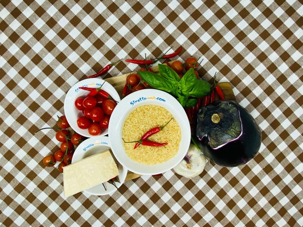 Dopo aver sbucciato ed eliminato le estremità delle melanzane tagliatele a cubetti, friggetele in olio extravergine di oliva e salatele. Lavate i pomodorini, divideteli a metà e rosolateli in padella con l’olio, uno spicchio d’aglio e qualche foglia di basilico. Cuocete il riso in abbondante acqua salata, scolatelo al dente e fatelo raffreddare. Aggiungete quindi le melanzane, i pomodorini ed i cubetti di parmigiano, condite con un filo d’olio ed un pizzico di pepe e profumate col basilico. Servite l’insalata di riso alla parmigiana a temperatura ambiente.