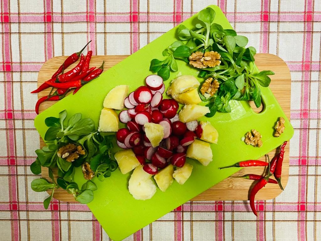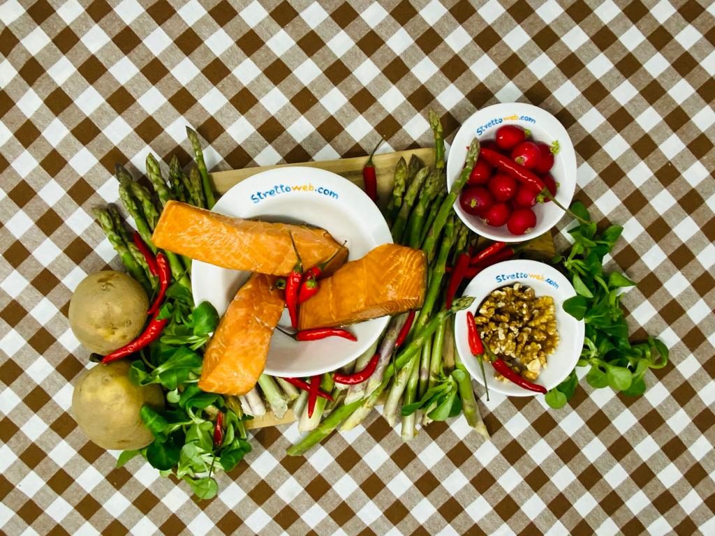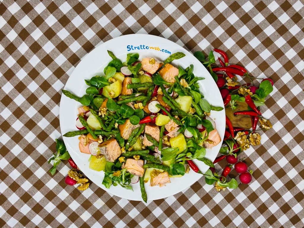 Lessate le patate in abbondante acqua salata ed a fine cottura pelatele e tenetele da parte. Pulite gli asparagi eliminando la parte dura del gambo, sbollentateli in acqua salata per 10 minuti e passateli sotto l’acqua fredda. Tagliate a cubetti i tranci di salmone, uniteli agli asparagi ed alle patate a dadini. Lavate la valeriana ed i ravanelli ed aggiungeteli al resto degli ingredienti. Completate con una spolverata di noci sbriciolate e condite l’insalata con sale, pepe ed olio extravergine di oliva.