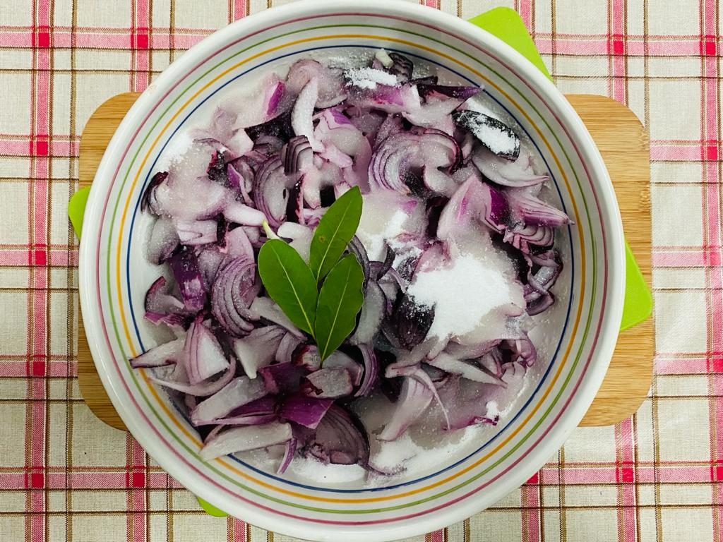 Pulite e tagliate a spicchi sottili le cipolle, mettetele in una ciotola capiente insieme allo zucchero, all’aceto, al sale ed alle foglie di alloro. Mescolate con cura, coprite la ciotola con la pellicola trasparente e lasciate macerare le cipolle per 6 ore in un luogo fresco. Al termine eliminate le foglie di alloro e mettete le cipolle in un tegame. Fatele bollire per circa 60 minuti a fiamma molto bassa finchè il composto non risulterà denso. Sistemate subito la marmellata nei vasetti di vetro che avevate precedentemente sterilizzato (mettendoli a bollire insieme ai tappi per 30-40 minuti) e fatela raffreddare tenendo i vasetti capovolti. Conservateli in un luogo fresco per un paio di settimane prima di consumare la marmellata.
