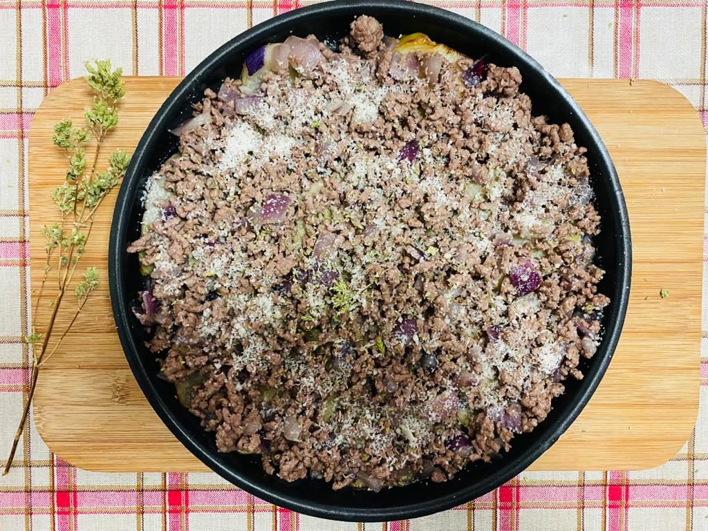 Piatto completo ed appetitoso lo sformato di carne e melanzane ricorda sia la classica parmigiana che la moussaka greca, un timballo sostanzioso realizzato a strati con melanzane e patate fritte, ragù di carne di agnello e maiale, formaggio e besciamella.