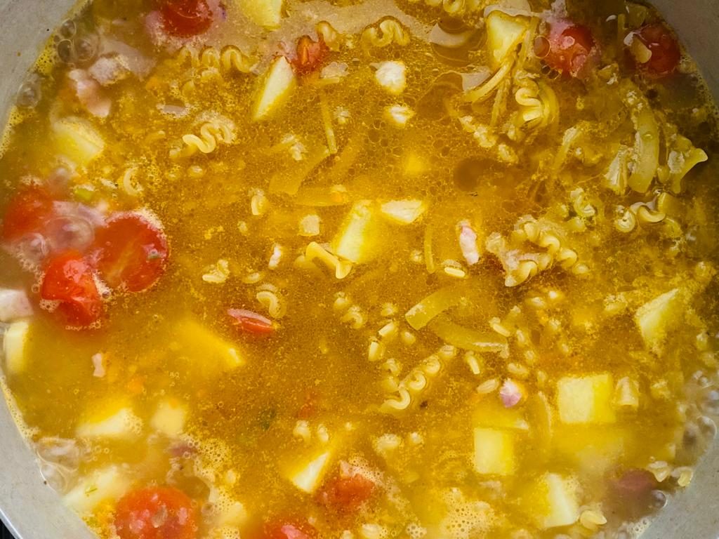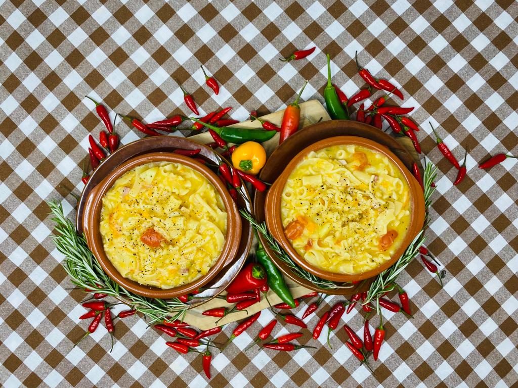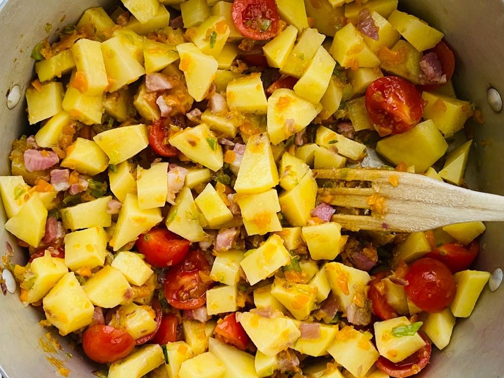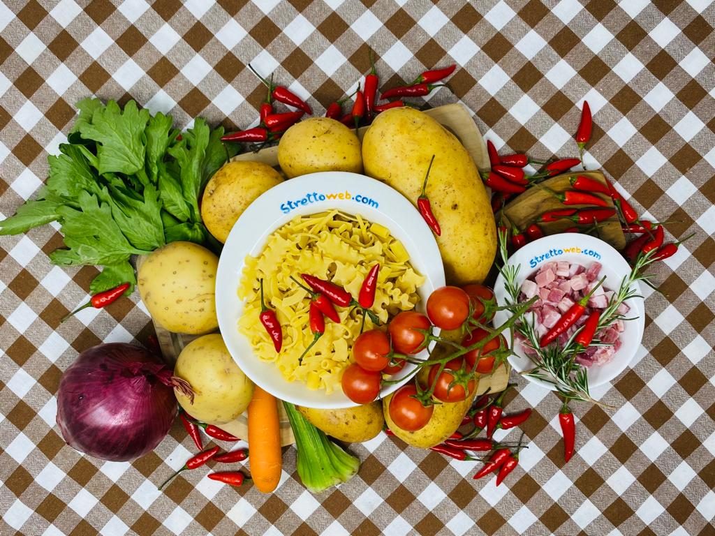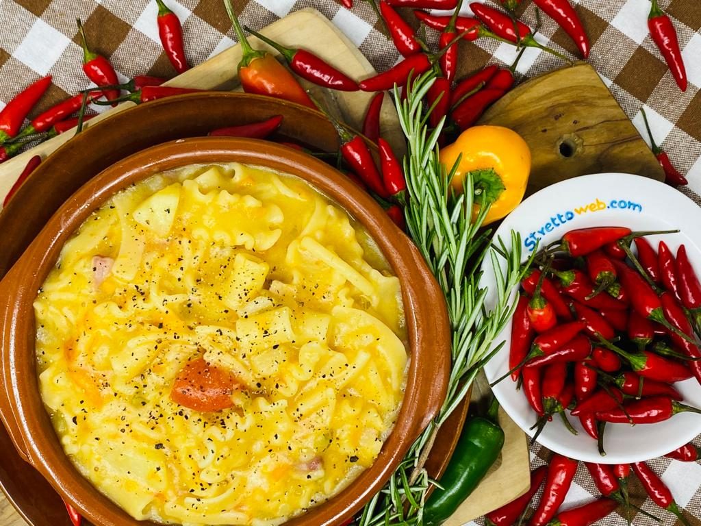 Tipico piatto della tradizione del Sud caratterizzata da pietanze saporite e nutrienti la pasta e patate è una ricetta semplice in cui la pasta e le patate cuociono lentamente fino ad amalgamarsi alla perfezione creando una consistenza morbida e cremosa. Se generalmente viene aggiunta la provola per accentuarne il gusto questa variante è arricchita da cubetti di pancetta calabrese DOP rosolati insieme ad un trito di sedano, carota e cipolla e capaci di donare un sapore unico al piatto.
