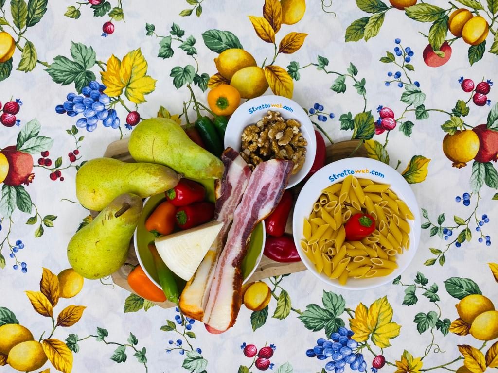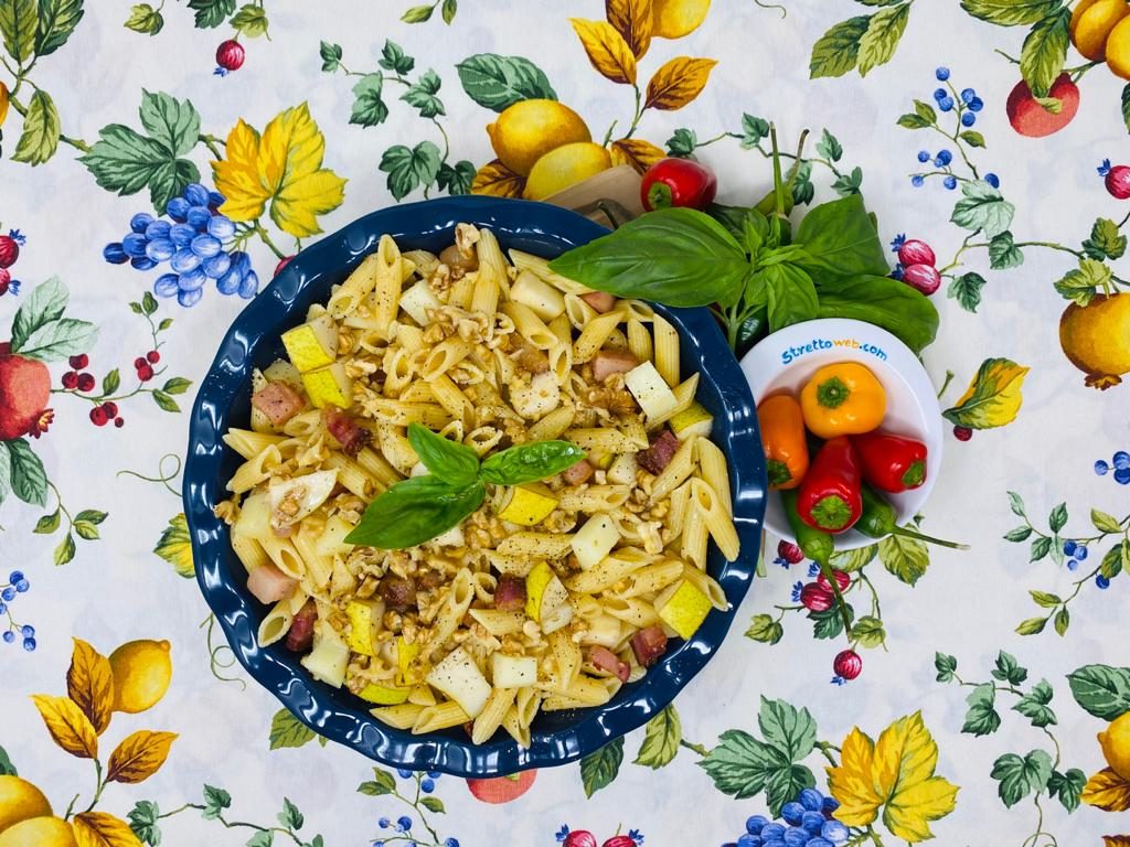 Piatto estivo nutriente e sfizioso la pasta fredda con pere, pancetta e noci unisce la dolcezza della frutta al sapore deciso ed avvolgente della pancetta calabrese. La croccantezza delle noci completa questa insalata di pasta ricca di gusto.