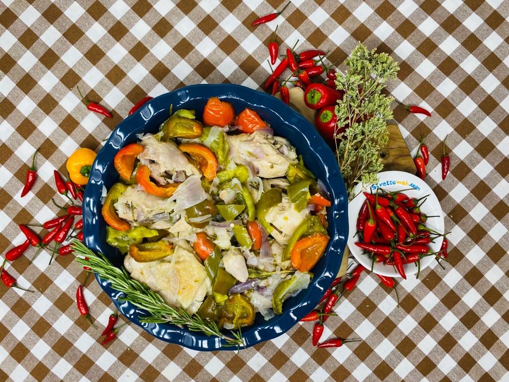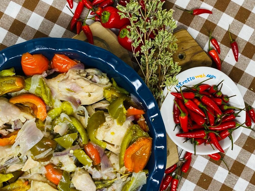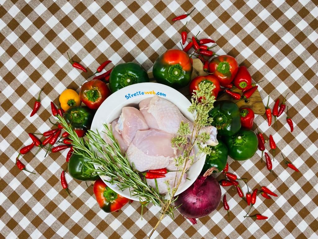 Fra le carni bianche quella del pollo è forse la più consumata merito di un basso contenuto di grassi, di un ottimo apporto di proteine e di un sapore delicato che la rende particolarmente versatile. L’abbinamento con i peperoni, ortaggi estivi per eccellenza, è infatti uno dei più riusciti. Frutti di una pianta appartenente alla famiglia delle solanacee come le melanzane, i pomodori e le patate i peperoni sono originari dell’America centro-settentrionale e solo dopo la scoperta del nuovo continente sono arrivati in Europa ed in Italia dove hanno trovato un clima perfetto per la loro coltivazione. Soprattutto in Calabria sono gli ortaggi estivi più diffusi infatti si consumano crudi, arrostiti, ripieni, in tortiera o in peperonata e questa molteplicità è merito dell’inventiva delle cuoche e della ricca produzione locale. Con un alto apporto di proprietà antiossidanti e depurative, vitamina C, sali minerali e fibre e con un basso contenuto calorico i peperoni sono perfetti nelle diete.