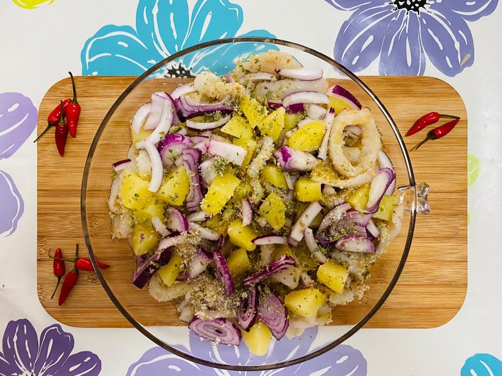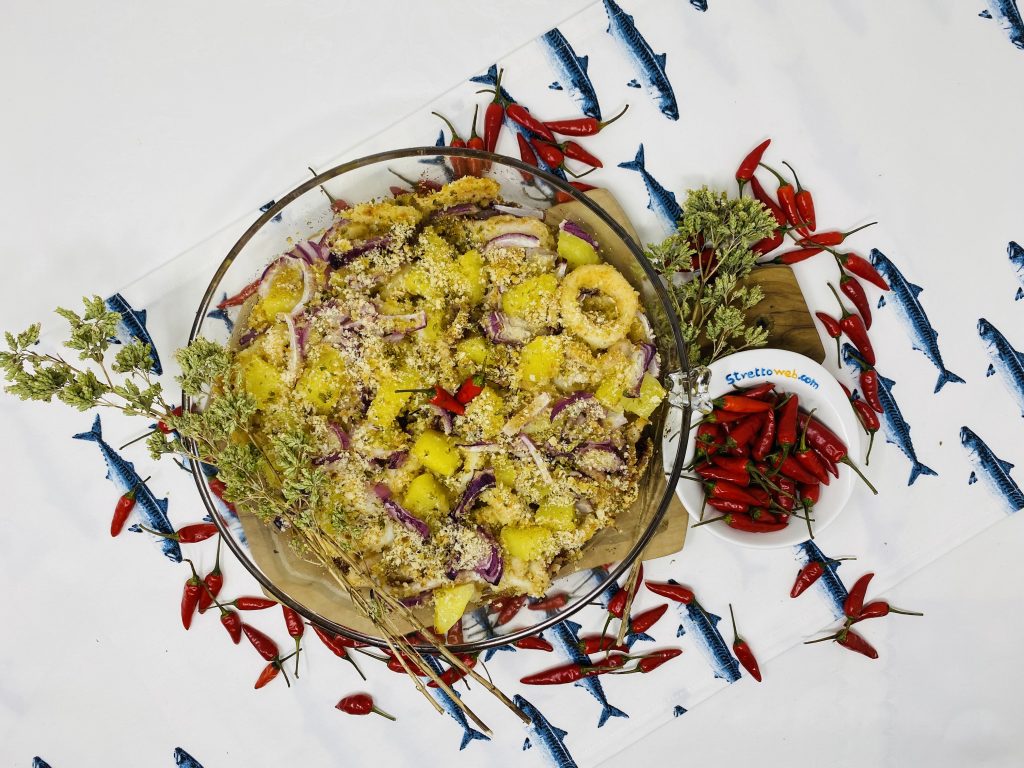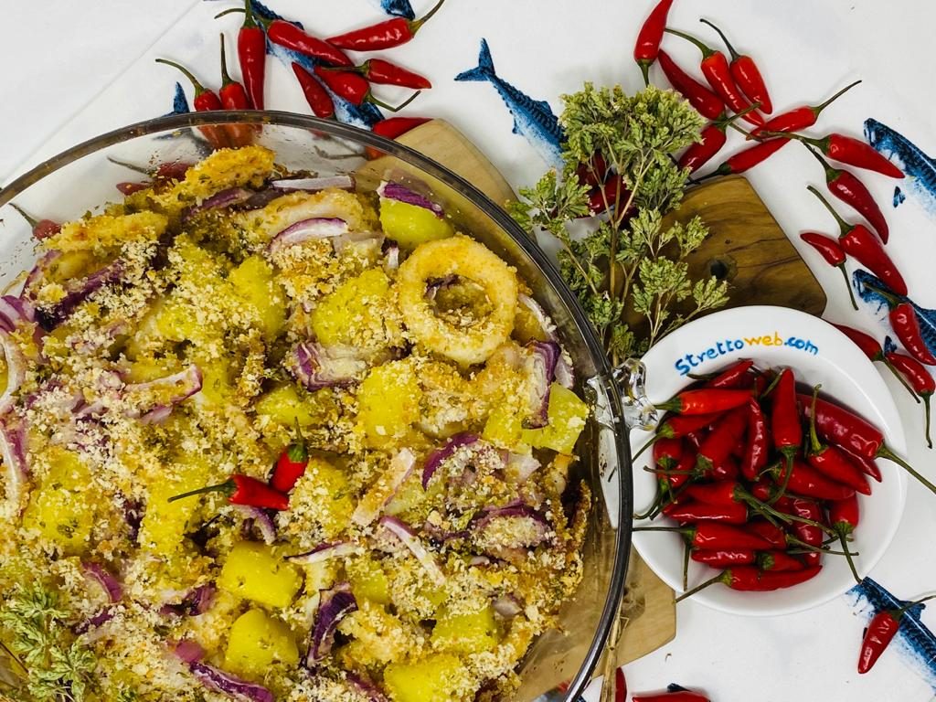Sciacquate i calamari già puliti e tagliateli ad anelli, metteteli in una teglia e versate un filo d’olio. Aggiungete il pangrattato ed amalgamate bene in modo che aderisca ai calamari. Cuocete in acqua bollente salata le patate a cubetti per 5 minuti e fatele raffreddare. Affettate la cipolla e poi coprite i calamari con i cubetti di patate e le cipolle, aggiungete l’aglio ed un pizzico di sale e ricoprite tutto con pangrattato, una spolverata di origano ed un filo d’olio. Infornate a 180 gradi per 30 minuti e servite.