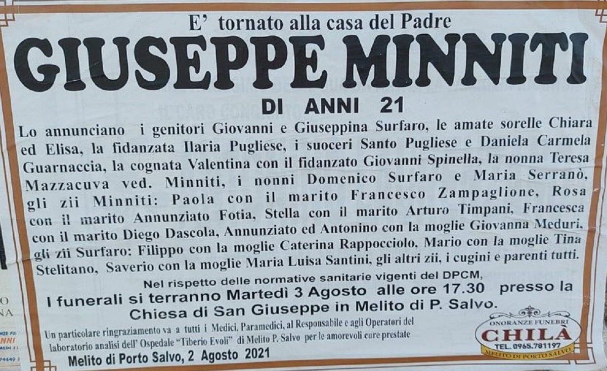 Paese in lutto a Melito Porto Salvo per la morte del giovane Giuseppe Minniti, deceduto dopo aver lottato per anni contro una grave malattia che purtroppo non gli ha lasciato scampo. Il 21enne ricordato da tutti come un ragazzo educato e sempre disponibile era un grande appassionato di moto e proprio oggi si sono svolti i funerali presso la Chiesa di San Giuseppe gremita di parenti, amici e conoscenti.