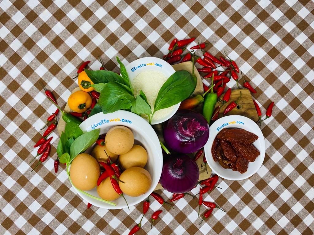 In Calabria la fine della stagione estiva coincide con la produzione delle conserve e questa tradizione dalle origini remote risale ai tempi della Magna Grecia quando gli ortaggi freschi venivano trasformati per essere disponibili durante tutto il resto dell’anno. Ma i pomodori sott’olio, i peperoncini ripieni, le melanzane o le olive vengono ancora sapientemente conservati nei famosi “buccacci”, dal greco “boukalion”. Alimento semplice e gustoso capace di mantenere le caratteristiche nutrizionali degli ortaggi freschi, fra cui il licopene, i pomodori sott’olio sono squisiti come antipasto accompagnati dal pane casereccio calabrese e regalano un sapore intenso a qualunque pietanza. Le cipolle rosse di Tropea IGP, note ormai sotto il profilo nutraceutico, aggiungono un gusto particolare alla frittata.