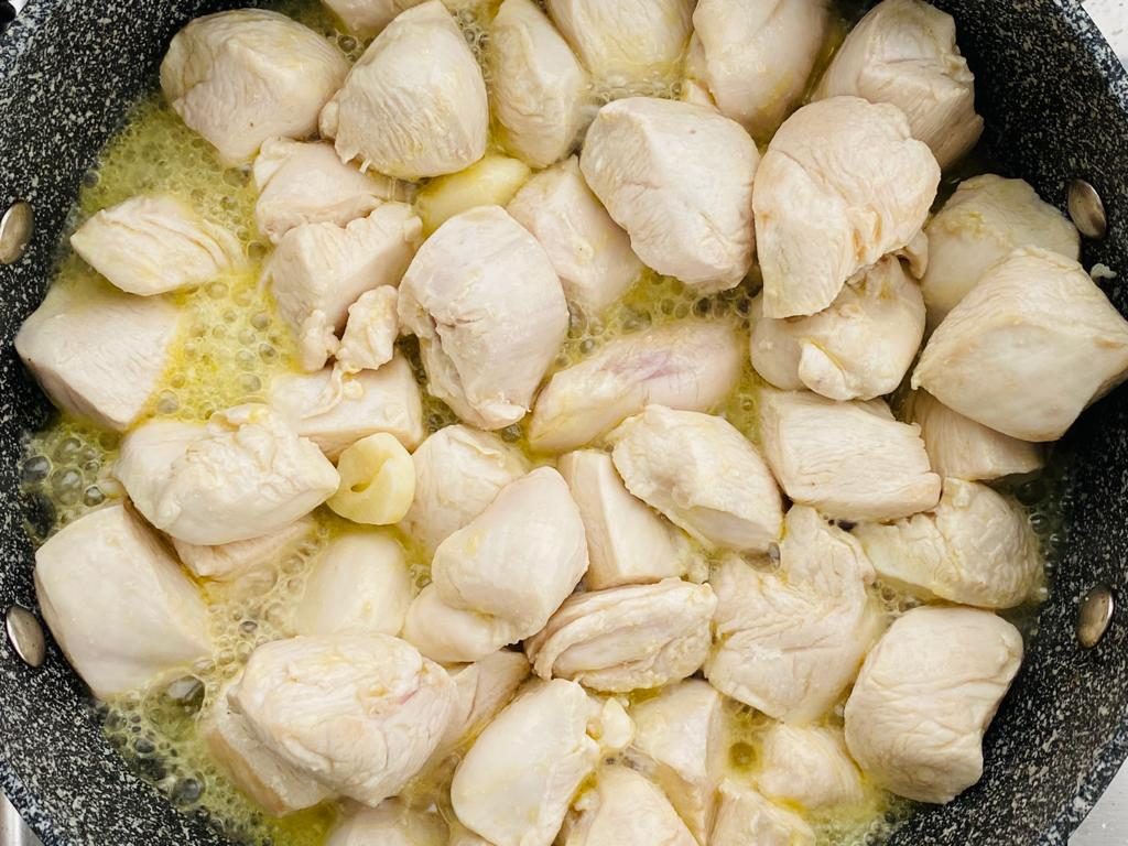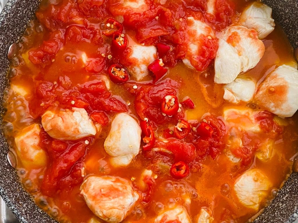 Iniziate tagliando a cubetti i petti di pollo ed eliminando le eventuali parti di grasso. In un tegame fate rosolare l’aglio con olio extravergine di oliva e versate i bocconcini di pollo cuocendoli a fiamma alta fin quando non saranno colorati, aggiungete un pizzico di sale e sfumateli con mezzo bicchiere di vino bianco. Appena il vino sarà evaporato unite i pelati spezzettati ed il peperoncino e proseguite la cottura per 25 minuti circa. Spolverizzate il prezzemolo tritato e servite subito lo spezzatino di pollo.