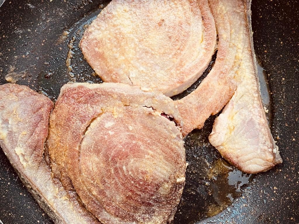 Fate riscaldare l’olio in padella, versate le cipolle tagliate a spicchi e lasciatele rosolare per circa cinque minuti. Aggiungete lo zucchero, l’aceto, un pizzico di sale, le foglie di alloro ed il timo. Mescolate gli ingredienti e fateli cuocere a fiamma bassa per dieci minuti fino a che le cipolle non si saranno appassite. Sciacquate le fette di tonno, tamponatele ed infarinatele uniformemente. Scaldate un filo d’olio in padella e scottatele due minuti per ogni lato. Unitele alle cipolle caramellate e servitele subito.