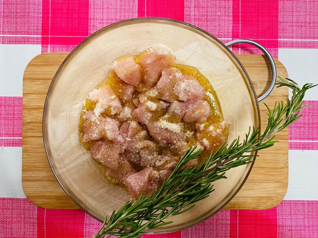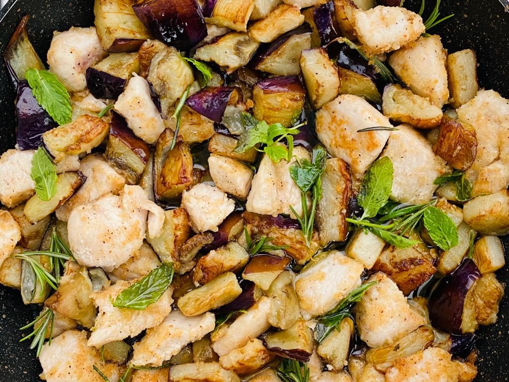 Lavate la melanzana, tagliate le estremità ed affettatela a dadini. Fatela riposare sotto sale per 20 minuti prima di sciacquarla, strizzarla ed asciugarla. Riscaldate l’olio di semi in padella e friggete i dadini di melanzana. Pulite il petto di pollo, tagliatelo a cubetti e versatelo in un recipiente con olio, sale, pepe ed una manciata di pangrattato prima di cuocerlo in padella per 10 minuti mescolando spesso. Quando sarà pronto aggiungete i dadini di melanzana, il rosmarino e le foglie di menta. Fate insaporire per qualche minuto e servitelo.