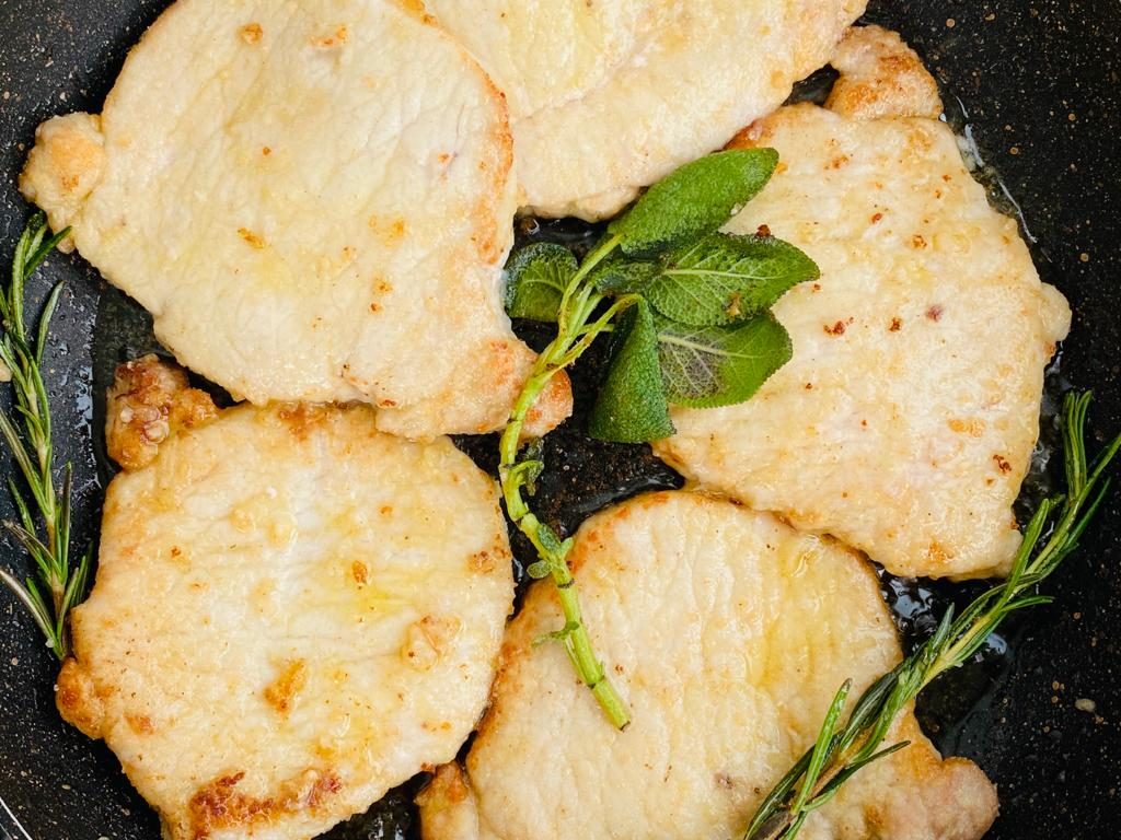 Squisite le cotolette di lonza passate per due volte prima nell’uovo e poi nel pangrattato aromatizzato da salvia, timo e rosmarino e fritte in olio di semi bollente.