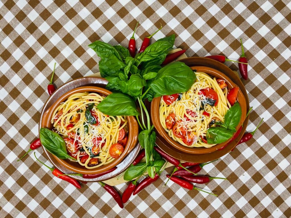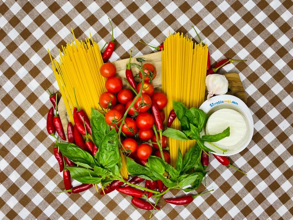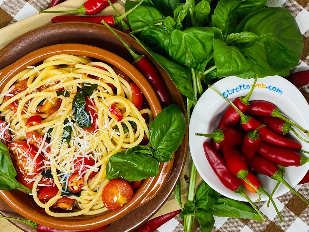Squisito primo piatto tipico delle Isole Eolie molto diffuso in Calabria ed in Sicilia la pasta al fuoco è una ricetta golosa e semplice da eseguire. I pomodorini datterini, infatti, marinati in olio extravergine di oliva con aglio, basilico, peperoncino e ricotta salata sono un condimento eccezionale per gli spaghetti!