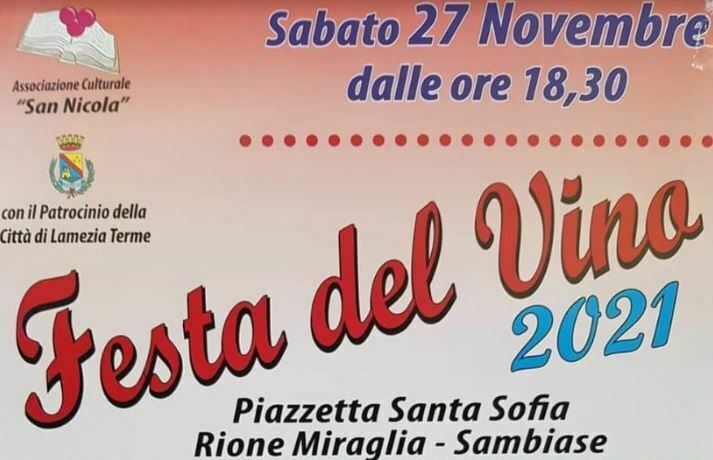 Si volgerà sabato 27 novembre alle ore 18:30 nella Piazzetta Santa Sofia del Rione Miraglia di Sambiase a Lamezia Terme la “Festa del Vino”, giunta alla IX edizione, organizzata dall’Associazione San Nicola del presidente Pino Morabito con il Patrocinio del Comune. L’ultima edizione della Festa del Vino risale al 2019, a causa dello stop forzato del 2020 per la situazione pandemica legata al Covid 19. Oltre ai componenti dell’associazione, alle autorità militari e religiose e ai numerosissimi cittadini, che negli anni precedenti hanno decretato il successo dell’iniziativa, saranno presenti il sindaco di Lamezia Terme Paolo Mascaro e i sindaci di Falerna, Francesco Stella, di Gizzeria, Francesco Argento, e di Conflenti, Emilio Francesco D’assisi.