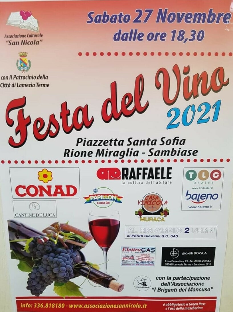 Come di consueto, il ricavato dell’iniziativa andrà in beneficenza (il prezzo d’ingresso è di 5 euro). “Da quattordici anni – afferma il presidente Pino Morabito – l’Associazione San Nicola è presente sul territorio con manifestazioni di carattere culturale e volte alla riscoperta e al consolidamento delle nostre tradizioni. Un contributo concreto e tangibile, ottenuto grazie e impegno, idee e valorizzazione delle realtà esistenti nel campo sociale, scientifico, culturale, artistico e storico. Per quanto concerne la Festa del Vino, che si svolgerà sabato 27 novembre, si coniugano più obiettivi: da una parte la valorizzazione delle nostre eccellenze enogastronomiche e dall’altro la rivitalizzazione di uno dei più bei centri storici della Calabria e del Mezzogiorno. Un ringraziamento particolare va all’Amministrazione comunale di Lamezia Terme, al sindaco Mascaro, all’assessore Luisa Vaccaro ed al consigliere comunale Antonio Lorena. Ed un sentimento di riconoscenza va all’architetto Bruno Aloisio”. L’evento si svolgerà con la partecipazione dell’Associazione “I Briganti del Mancuso” e nel pieno rispetto delle normative anti Covid: obbligatori per accedere il green pass e l’uso della mascherina.