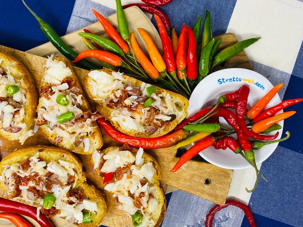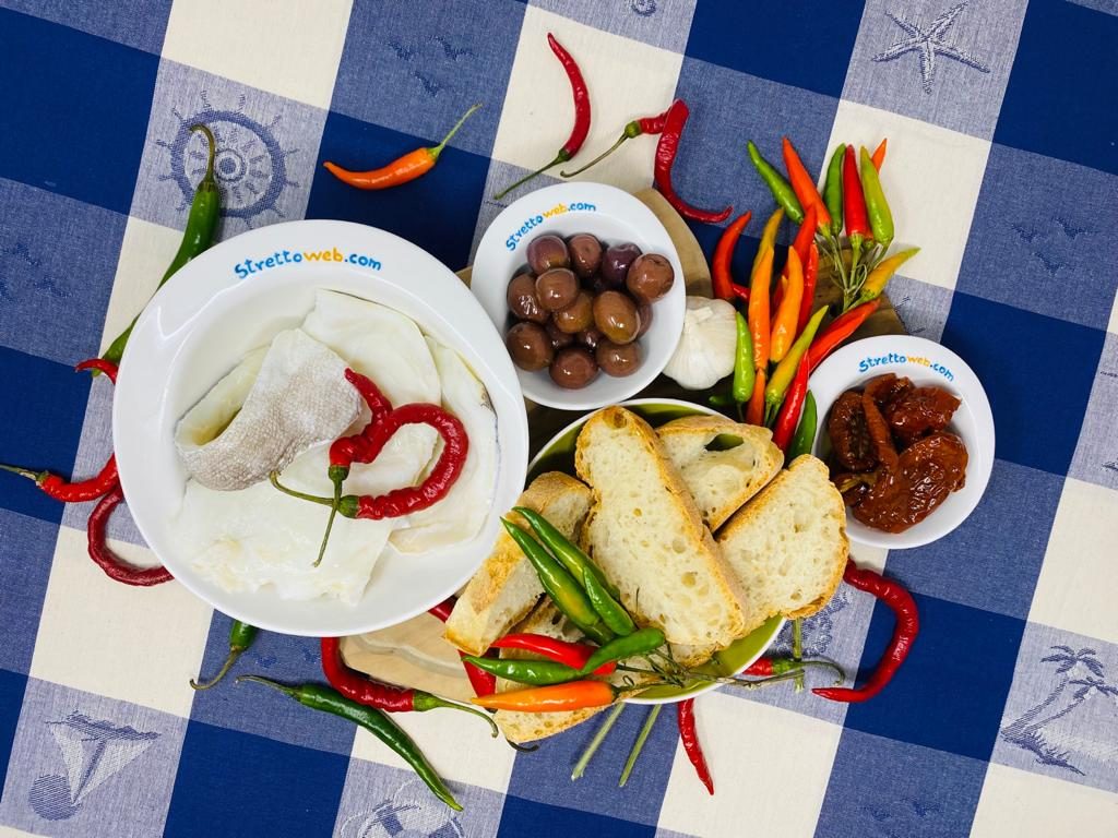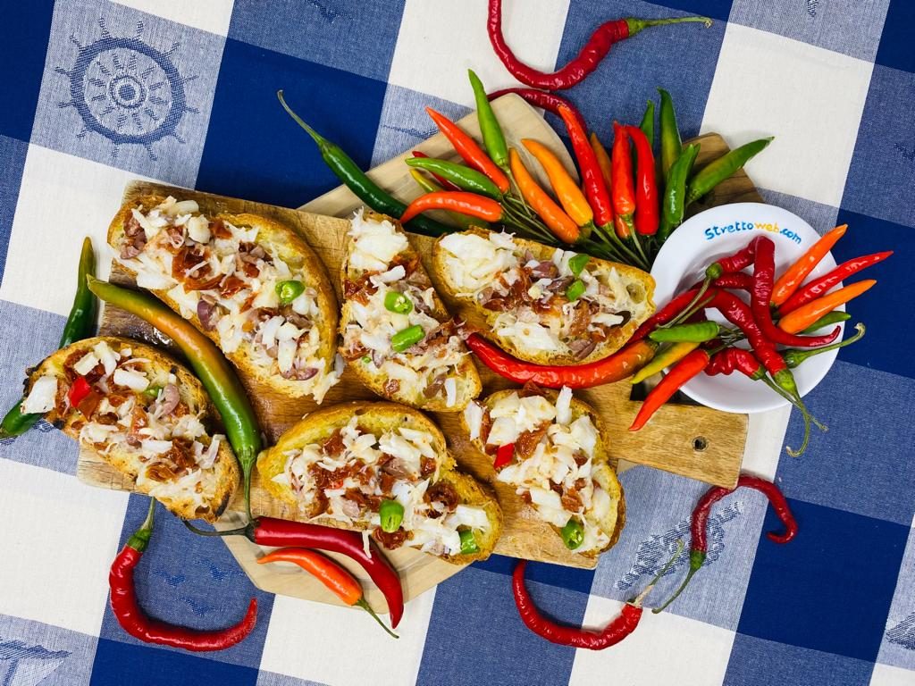 Perfette per un ricco aperitivo le fette di pane casereccio croccanti farcite con uno squisito composto di baccalà, pomodori secchi sott’olio, olive nere e peperoncino sono caratterizzate da un gusto intenso ed avvolgente!