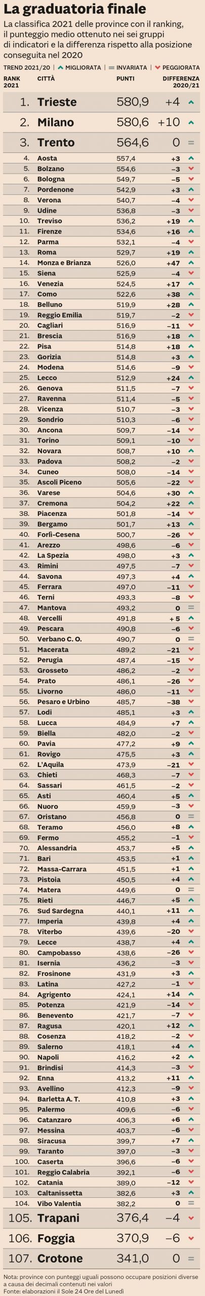 I risultati dell’indagine evidenziano la netta disparità tra il Nord e il Sud del Paese. Stabile nelle ultime posizioni, quasi a confermare l’urgenza degli investimenti del Pnrr in arrivo per ridurre i divari, il Mezzogiorno. Crotone è ultima (107° posto), come lo scorso anno, anticipata da Foggia e Trapani che scivolano sul fondo. Come detto, in fondo sia Reggio Calabria, 101ª in classifica, che Messina, al 97° posto. Entrambe perdono sei posizioni rispetto alla graduatoria dello scorso anno, che vedeva la città siciliana quindi al 91° posto, e quella calabrese al 95°. Su novanta indicatori le ultime posizioni sono popolate in ben 57 casi da province del Sud o delle Isole. E le prime province non del Mezzogiorno che si incontrano, partendo dal fondo e salendo verso l’alto, sono Latina (83ª) e Frosinone (82ª), seguite a poca distanza da Imperia (77ª).