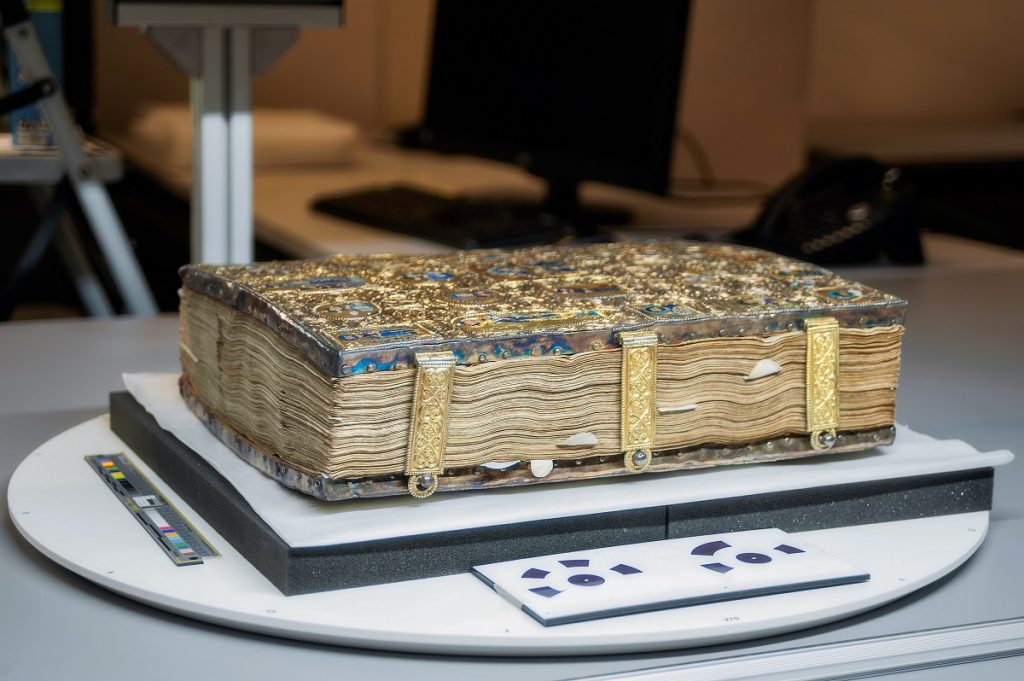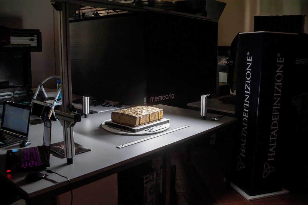 La tecnica fotografica gigapixel+3D adottata da Haltadefinizione per l’acquisizione digitale non entra in contatto diretto con il bene oggetto di ripresa, garantendo la più elevata qualità di riproduzione digitale e, al contempo, la massima tutela dell’originale. Data la particolare delicatezza e importanza del manoscritto, tutte le operazioni di digitalizzazione sono state condotte in loco, dove il personale interno ha eseguito anche una copia completa delle carte interne che compongono il codice. Inoltre, l’acquisizione tridimensionale della coperta riccamente decorata ha permesso di mappare con precisione tutte le forme dell’oggetto rispettando fedelmente la resa di colori, toni, dettagli, geometria, nitidezza e illuminazione della superficie. Le tecnologie di digital imaging sono al giorno d’oggi una preziosa fonte