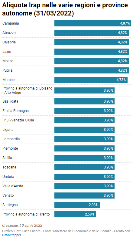 La Regione con la più alta aliquota Irap è la Campania con 4,97%, seguono con 4,82% Abruzzo, Calabria, Lazio, Molise e Puglia. Dopo le Marche col 4,73% seguono varie regioni e la Provincia autonoma di Bolzano – Alto Adige con 3,9%. Infine la Sardegna con 2,93% e la Provincia autonoma di Trento con l’aliquota Irap più bassa pari al 2,68%.