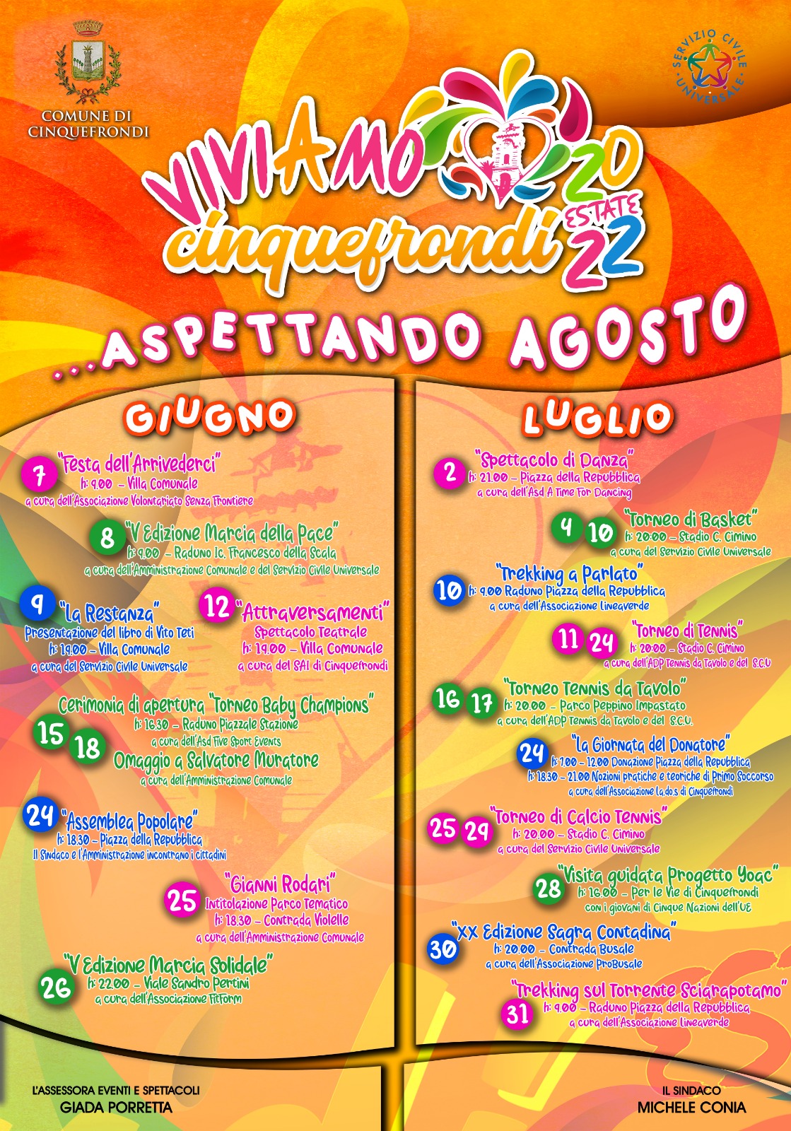 L'Amministrazione Comunale in collaborazione con il Servizio Civile Universale e le Associazioni cittadine, hanno dato vita ad un cartellone di eventi denominato "Viviamo Cinquefrondi …Aspettando Agosto"