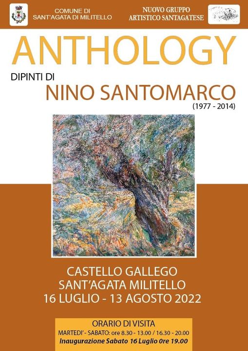 La mostra “Anthology dipinti di Nino Santomarco”, curata dall’architetto Nuccio Lo Castro, è organizzata dall’Associazione culturale Nuovo Gruppo Artistico Santagatese e dall’Amministrazione Comunale di Sant’Agata Militello, Assessorato alla cultura, che vogliono ricordare Nino Santomarco, come artista e come cittadino dai molteplici interessi, che ha vivacizzato la vita culturale della città: è stato giornalista pubblicista, editore del periodico “Il Valdemone”, socio fondatore ed animatore della compagnia teatrale del Gruppo Artistico Santagatese, ideatore ed organizzatore delle Biennali d’Arte città di Sant’Agata Militello, Assessore alla cultura ed amministratore attento e responsabile. La mostra potrà essere visitata da martedì a sabato dalle ore 8:30 alle 13:00 e dalle 16:30 alle 20:00 fino al 13 agosto 2022.