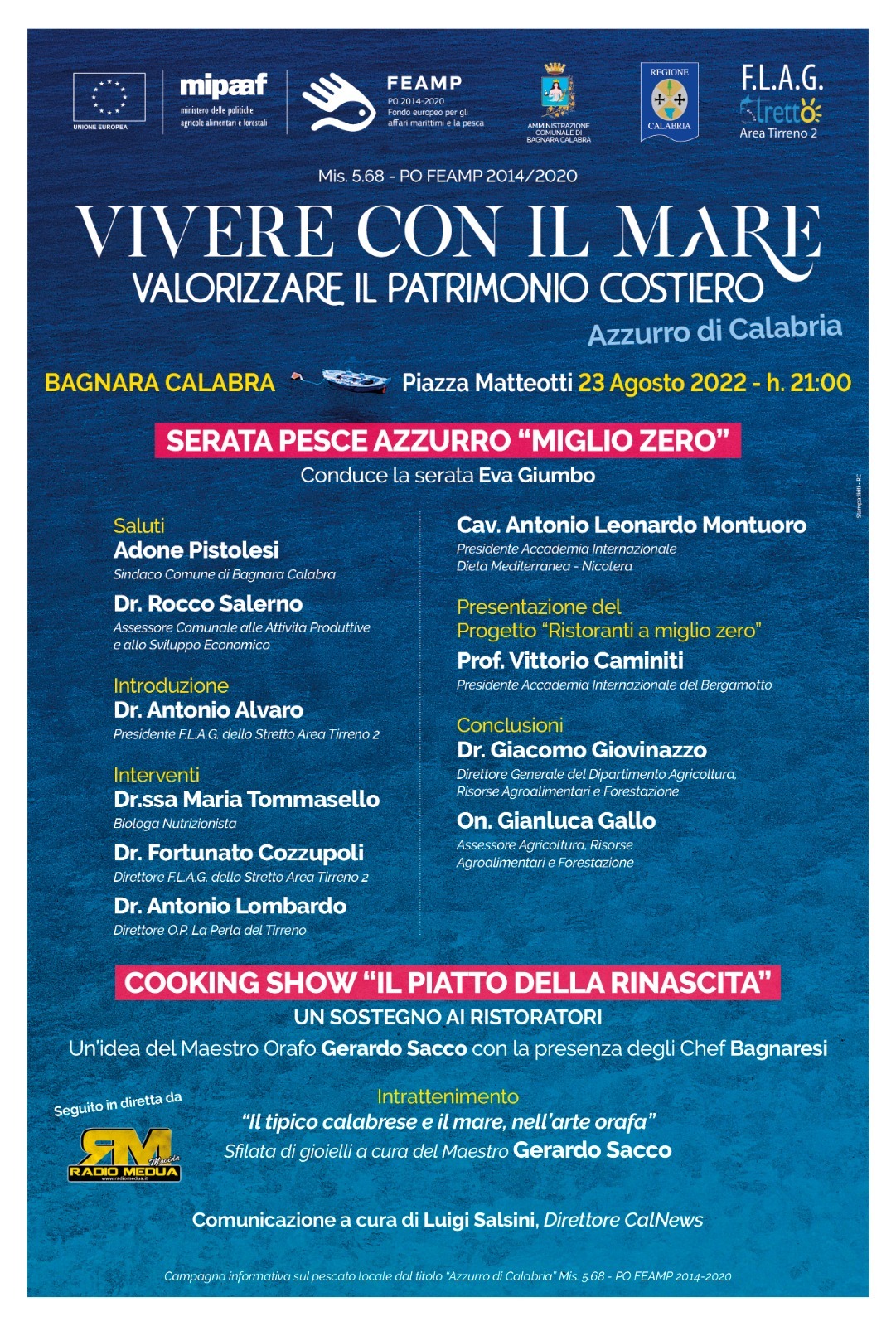 Martedì 23 agosto, alle ore 21.00, il Flag dello Stretto Tirreno 2 sarà in piazza Antonio Gramsci a Bagnara Calabra (Rc), con l’evento “Vivere con il mare, valorizzare il patrimonio costiero”, iniziativa collegata ad “Azzurro di Calabria”. Una grande ed importante kermesse fortemente voluta dal sindaco di Bagnara Calabra Edone Pistolesi e dal presidente del Flag, Antonio Alvaro. Giunta alla sua seconda edizione, non poteva che ricominciare dalla perla della Costa Viola. Questa iniziativa è a sostegno della categoria dei ristoratori e dei pescatori locali, che più di tutti hanno subito gli effetti negativi della pandemia e del Covid-19. Attività sostenuta dall’assessorato alle politiche agricole della Regione Calabria e dall’assessore Gianluca Gallo, con il coordinamento del direttore generale Giacomo Giovinazzo. Con questa attività si vuole mettere in relazione i pescatori con i gli imprenditori della ristorazione, per incentivare un maggior consumo del pesce povero, quello azzurro.